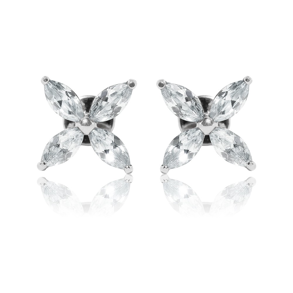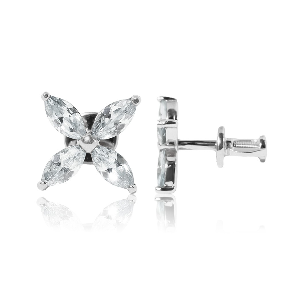 Описание: Яркие и практичные серьги-гвоздики с фианитами – идеальный вариант украшения для стильной и современной девушки. Серьги изготовлены из высококачественного серебра 925 пробы, инкрустированы фианитами огранки «Маркиз». Изделия с винтовым замком отличаются надежной и крепкой фиксацией на ухе, риск самопроизвольного расстегивания и потери очень мал. Нежные серьги-гвоздики в форме цветка с четырьмя лепестками подчеркнут вашу романтичную натуру. Такие серьги-гвоздики могут подойти девочкам дошкольного и школьного возраста, подросткам, молодым девушкам и женщинам. Яркие и блестящие серьги-гвоздики можно носить каждый день, так и на свидание или прогулку с подругами. Серьги скромные, без лишних и кричащих деталей, станут любимым украшением в вашей коллекции. Серебряные серьги-гвоздики с фианитами – беспроигрышный вариант подарка близкому человеку. Такое ювелирное украшение подарит много радостных эмоций и восторга.