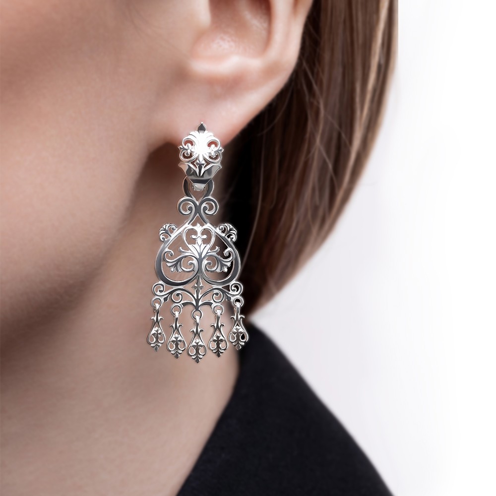 Описание: Изысканные серебряные серьги 2 в 1 – настоящее произведение искусства. Ювелирное изделие выполнено в этническом стиле из серебра 925 пробы. Английский замок надёжно фиксирует их на ушах, позволяя вам наслаждаться каждым мгновением. Серьги полностью украшены великолепными растительными орнаментами, которые обвивают изделия, придавая им нежный и в то же время роскошный вид. Орнаменты словно танцуют на поверхности, отражая свет и создавая уникальные блики, которые притягивают взгляды. Подвес можно легко открепить, что позволяет носить их двумя способами. Эти серьги станут не только стильным дополнением вашего образа, но и настоящим произведением искусства, вдохновляющим вас на новые свершения.