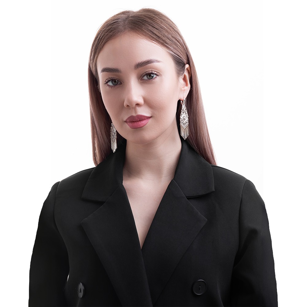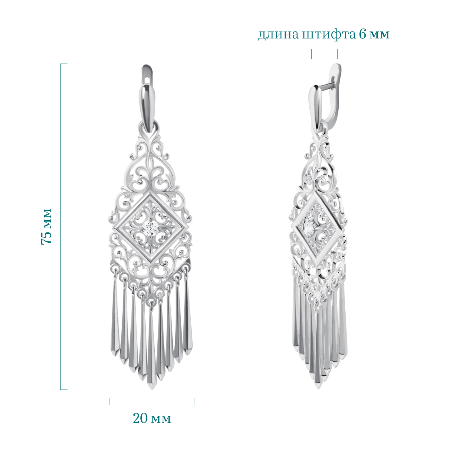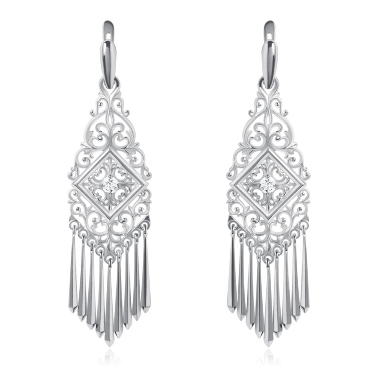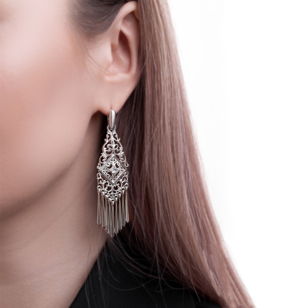 Описание: Роскошные якутские серьги с фианитом цепляют внимание своим ярким блеском и элегантным дизайном. Основу серёг можно носить отдельно без подвесок, что очень практично. На подвесках изображены орнаменты с растительными мотивами, характерные якутской культуре. Внимание привлекает центральный элемент в форме квадрата, на котором вставлен фианит – камень с алмазным блеском. Белый фианит замечательно ловит свет и создаёт эффект мерцания, он прекрасно подходит к серебряным серьгам, подчеркивает чистоту и блеск металла. Свисающие длинные подвески придают украшению изысканности. По якутским поверьям, подвески на серьгах выполняют функцию защиты, их звенящий звук отпугивает от злых духов. Украшение имеет идеальную длину, которая выделяет длину шеи и линию плеч. Это серебряное изделие эффектно украсит ваш вечерний или свадебный образ.