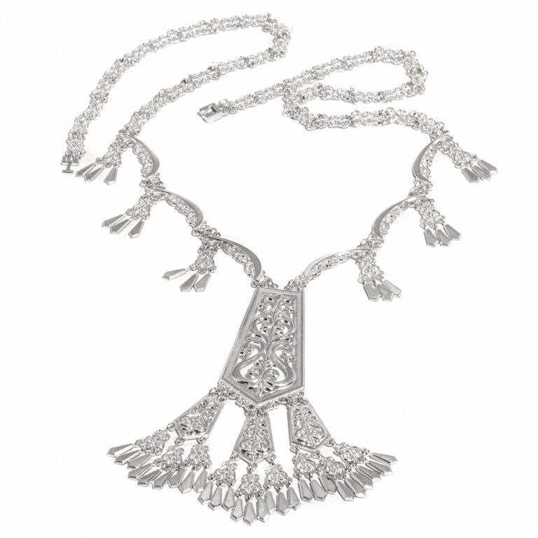 Описание: Женское нагрудное украшение изготовлено из серебра 925 пробы и выполнено в современном стиле. Необычный дизайн и сложные формы придают украшению оригинальности. Изделие декорировано лировидными орнаментами, которые символизируют плодородие и развитие. Свисающие маленькие подвески напоминают кристаллы льда и олицетворяют вечную мерзлоту и якутский холод. Сложная техника исполнения и импровизация с формами дарят гармонию и радость для ювелирных эстетов. Нагрудное украшение из серебра сочетается с любой одеждой. Это тот самый вариант на все случаи жизни.