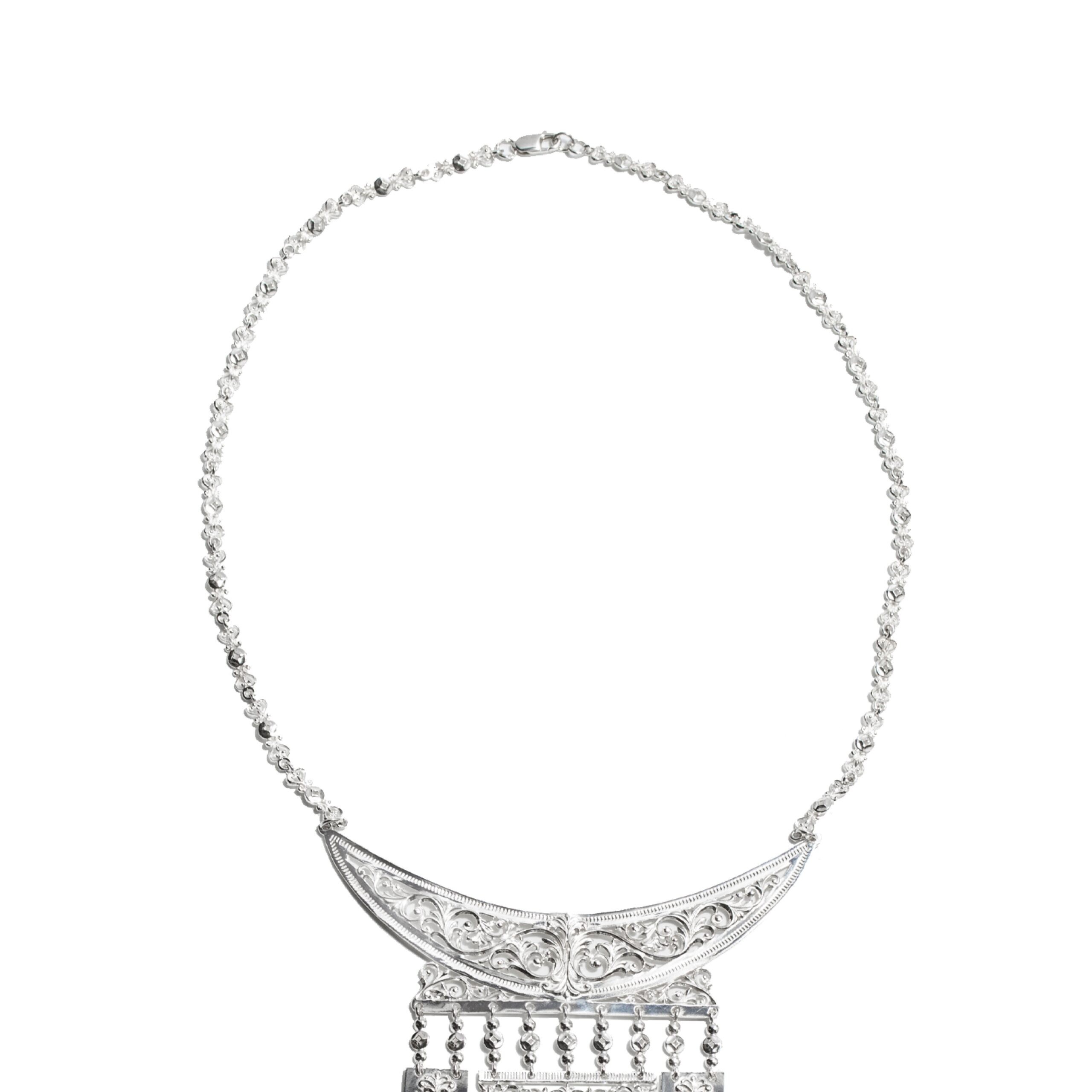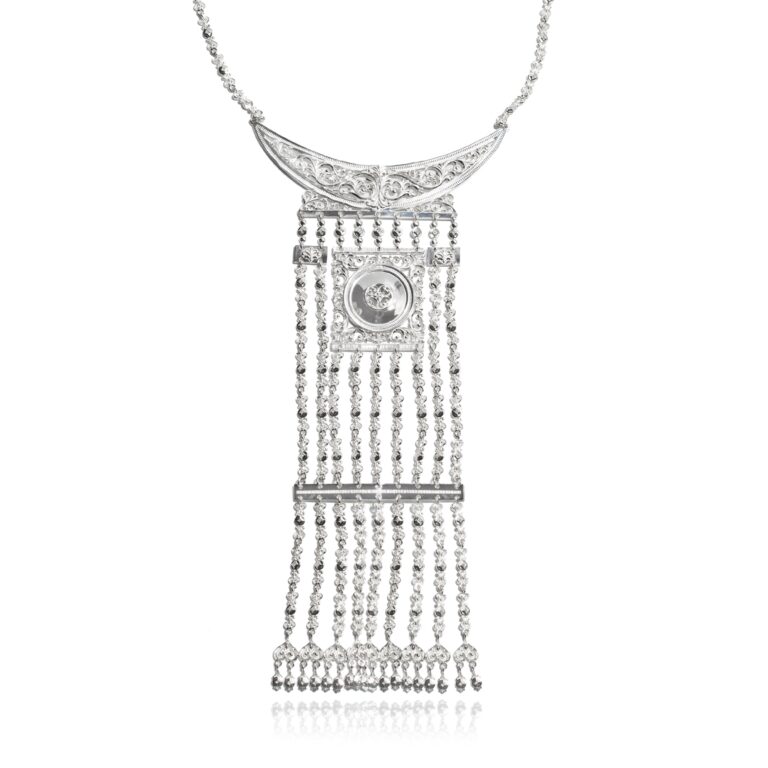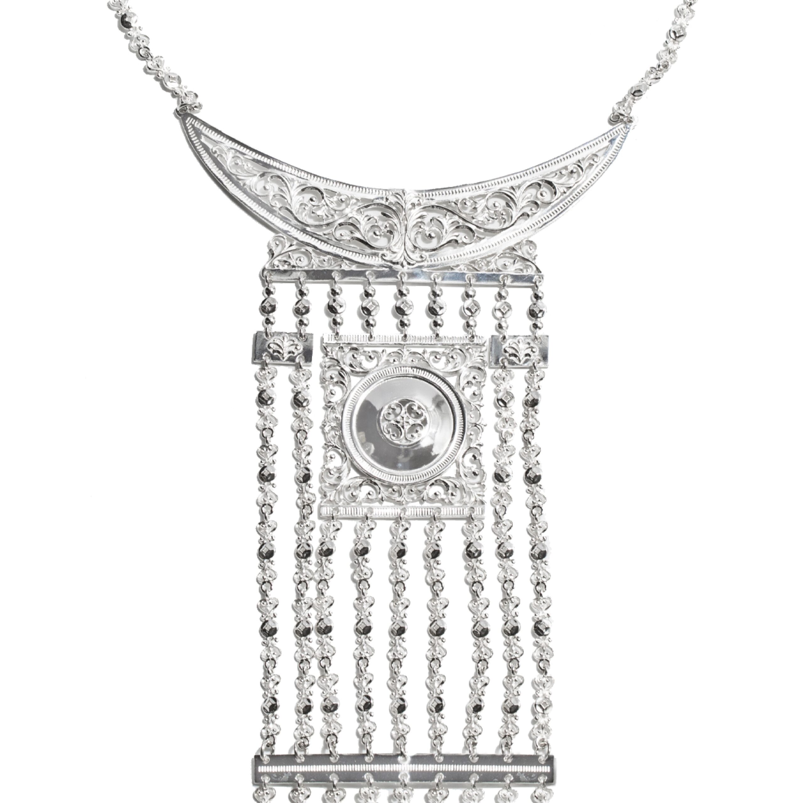 Описание: Женское нагрудное украшение изготовлено из серебра 925 пробы. Национальное украшение выполнено в современном стиле. Все детали изделия инкрустированы лировидными и растительными орнаментами. Традиционно в центре украшения разместился солярный диск “Күн”, по кругу выгравирован гребенчатыми орнаментами, которые символизирует плодородие. Маленькие подвески в виде лиры и круглого орнамента последовательно соединяются и образуют длинные цепочки. Серебряное нагрудное украшение – отличное решение для любого наряда – будь это национальное платье или классический вечерний наряд.